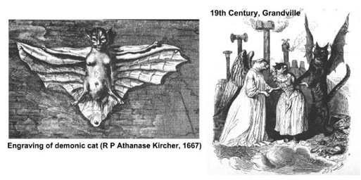 – Comme les chauves-souris, les chats sont parfois associés au Diable. En conséquence, des chats dotés d’ailes membraneuses ont parfois été dessinés pour représenter des démons.