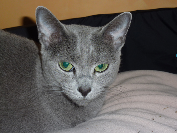 Nous sommes tombés – Comme Obelix dans la potion magique – follement amoureux du Bleu Russe et cet amour tant du point de vue de l’esthétique de ce chat que de son caractère et de son comportement ne s’est jamais démenti…